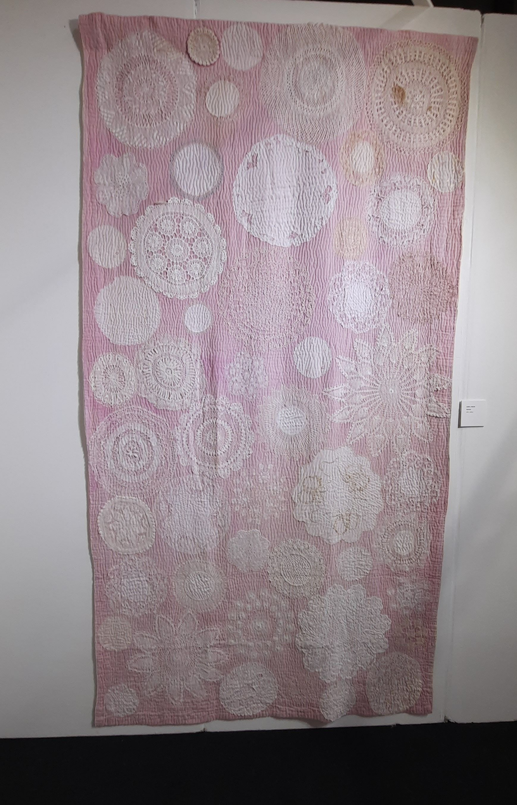 Judith E Martin’s stand (titled ‘Softer and Dreamier’) featured large hand-stitched art quilts which I would describe as delicate, sensitive and moving. I stayed a long time looking at them, using the artist’s helpful notes as an aid to understanding the sentiments explored and evoked in these lovely works. This is ‘Stardust’
