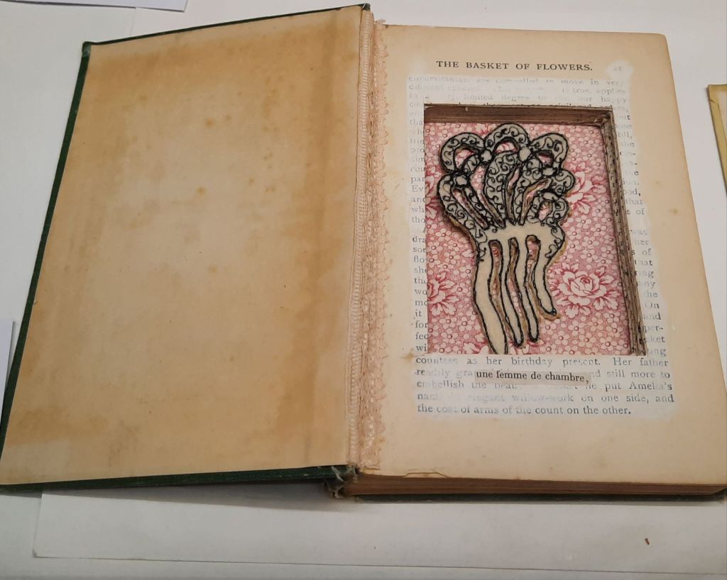 She also made ‘Altered Book – Hair Comb’ where the attractive sinuous shapes of the comb worked beautifully against the print fabric behind.