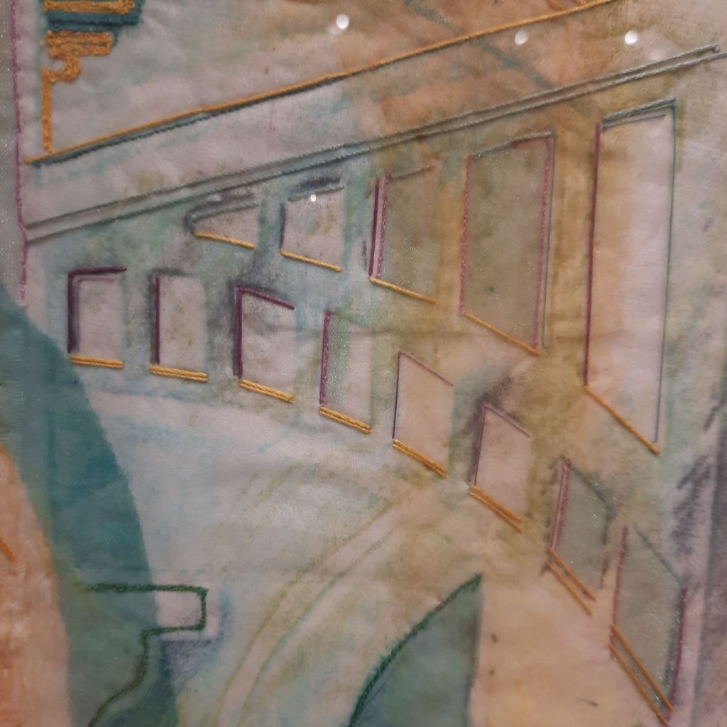 Roberta Mcpherson’s piece ‘Bridge in Sunlight, Southwark’ was an intriguing, multi-layered architectural study, including clever use of transparent fabrics, as seen in the detail photo below.