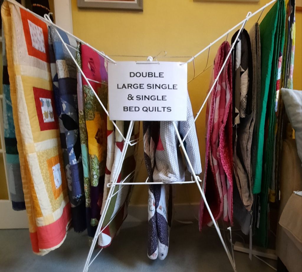 An everyday laundry dryer works well for displaying single-bed and double-bed quilts – it is easier to see them than if they were stacked in a pile.