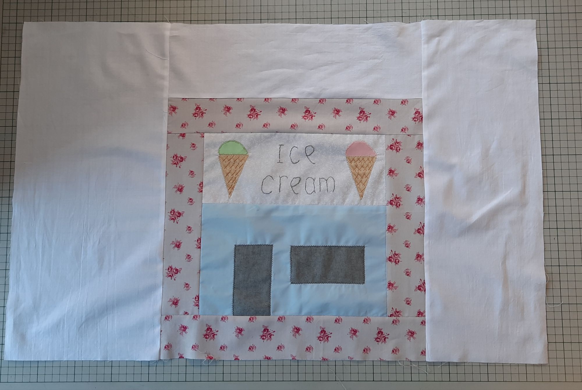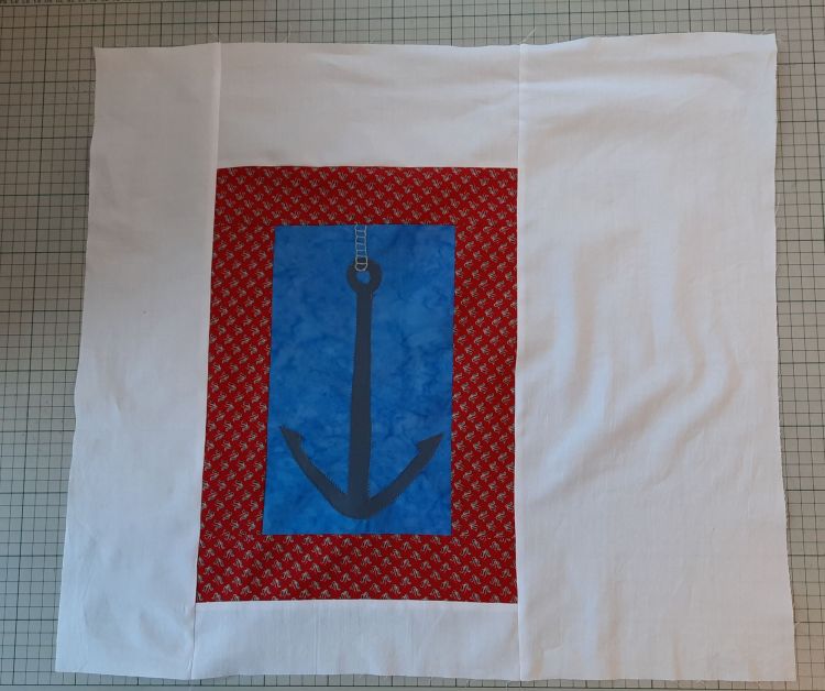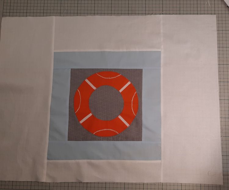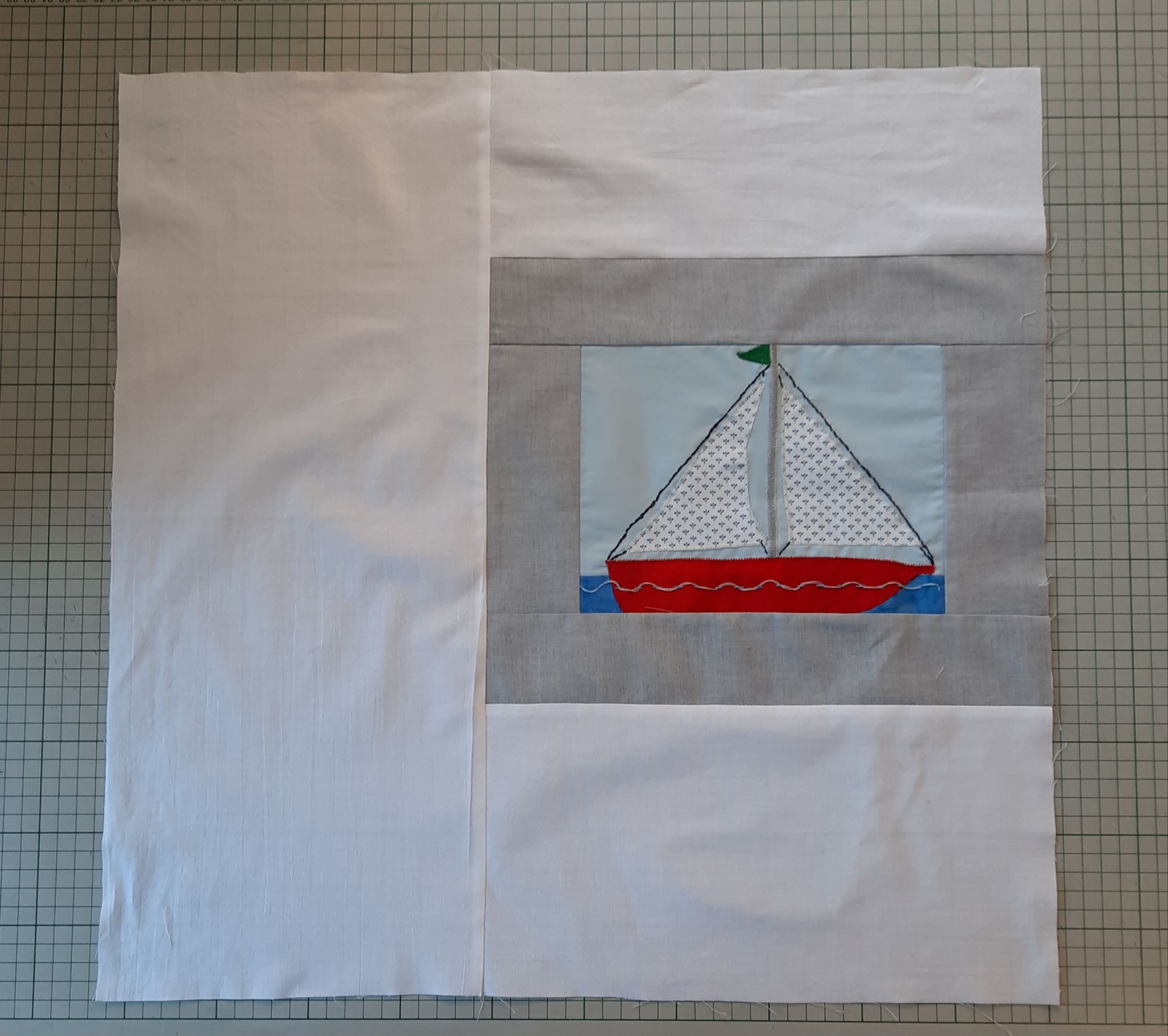 5 Stitch piece [9] above the yacht block. Press up. Add [10] below the yacht block. Press down. Stitch [11] to the left of the block. Press right.