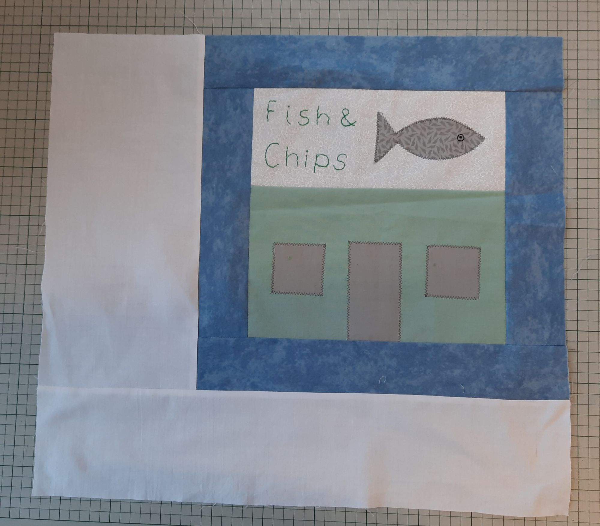 9 Join piece [20] to the left of the Fish Shop block (press right). Add piece [21] below (press down).