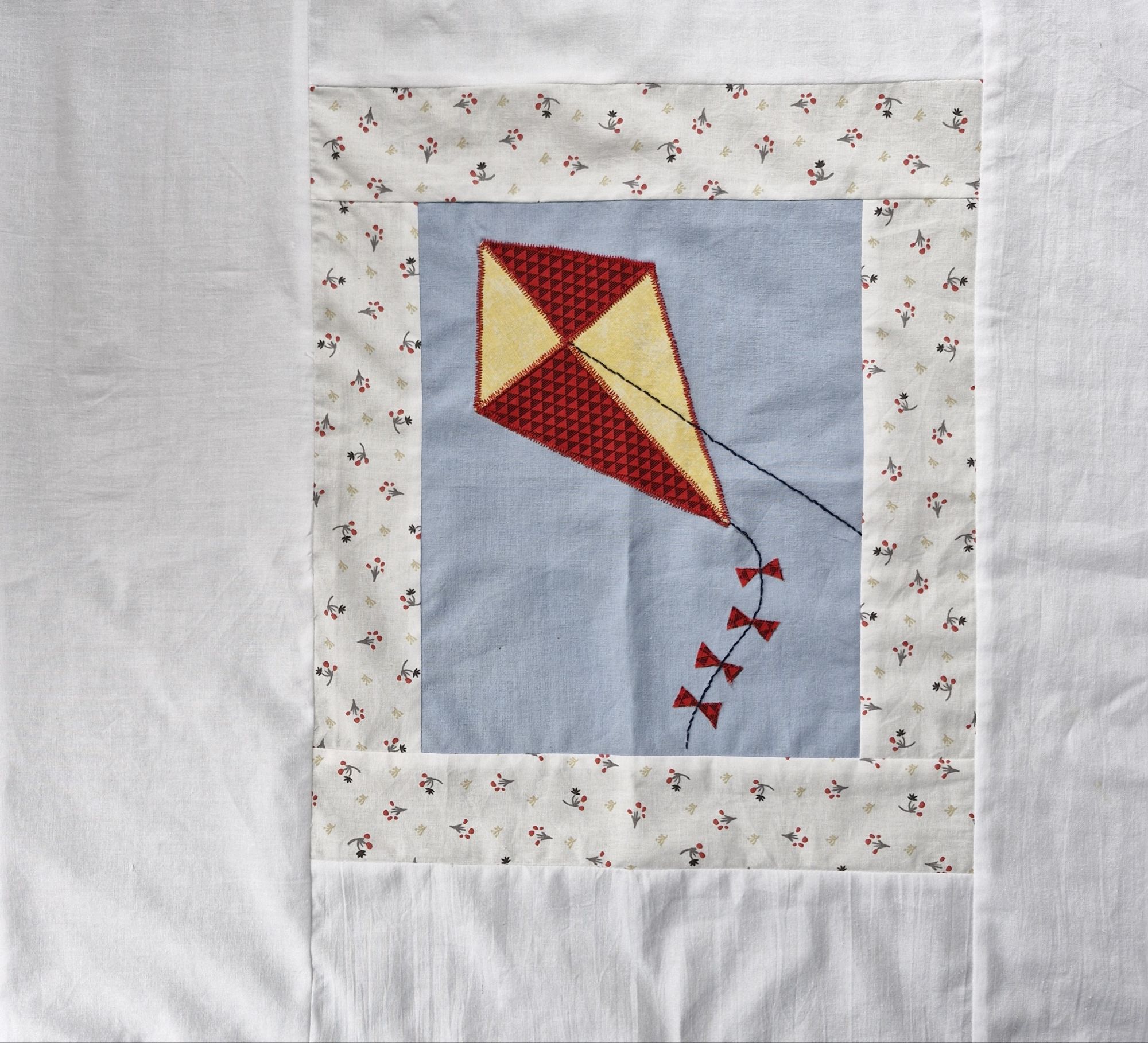 6 Stitch [12] above the kite block. Press up. Add [13] below the block. Press down. Stitch [14] to the left of the block (press right) and [15] to the right of the block (press left).