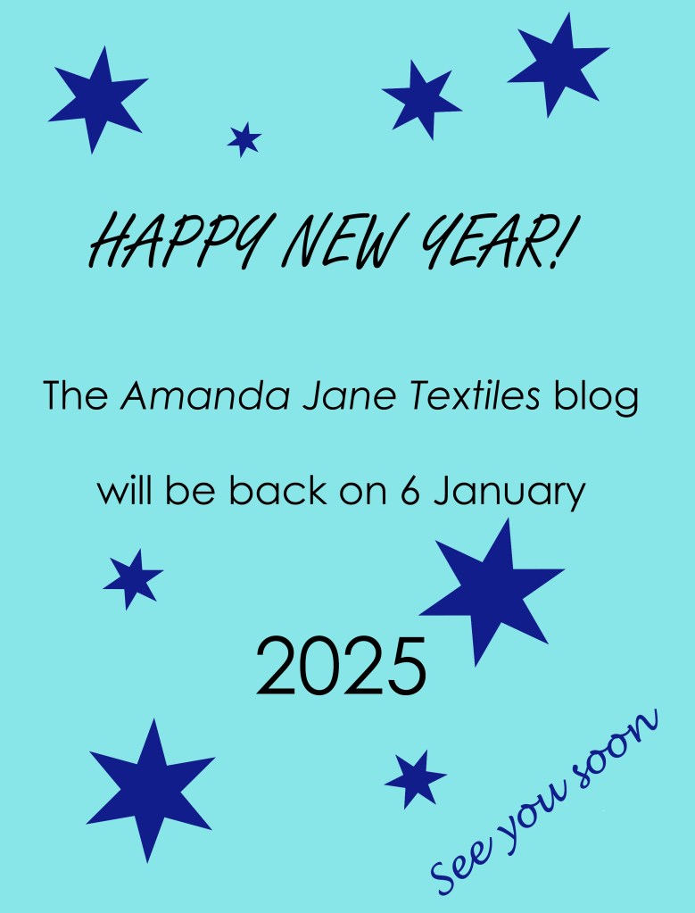 New Year 2025 Posted byAmanda Jane Textiles30/12/2024Posted inBloggingTags:Amanda Jane Textiles blog, New Year Share this: Click to share on Facebook (Opens in new window) Facebook Click to share on LinkedIn (Opens in new window) LinkedIn Like Loading... Published by Amanda Jane Textiles Artist, designer, maker and teacher View more posts