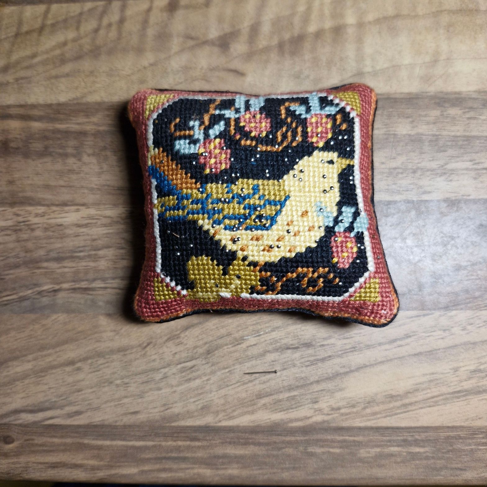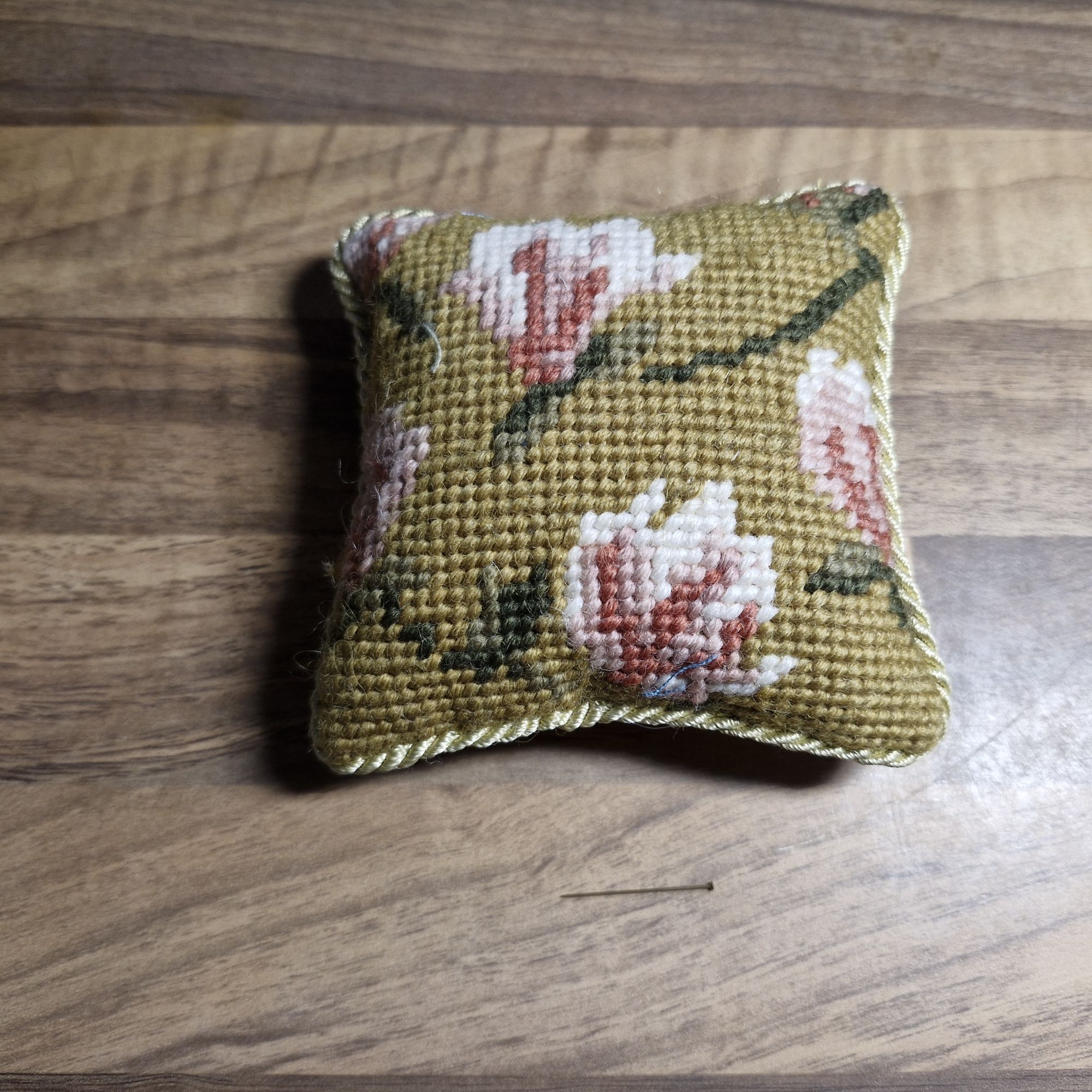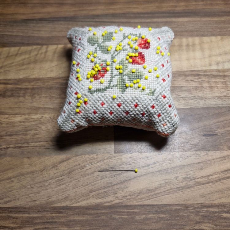 This pincushion also has a needlepoint side, but these gold pins show up better on the velvet side!