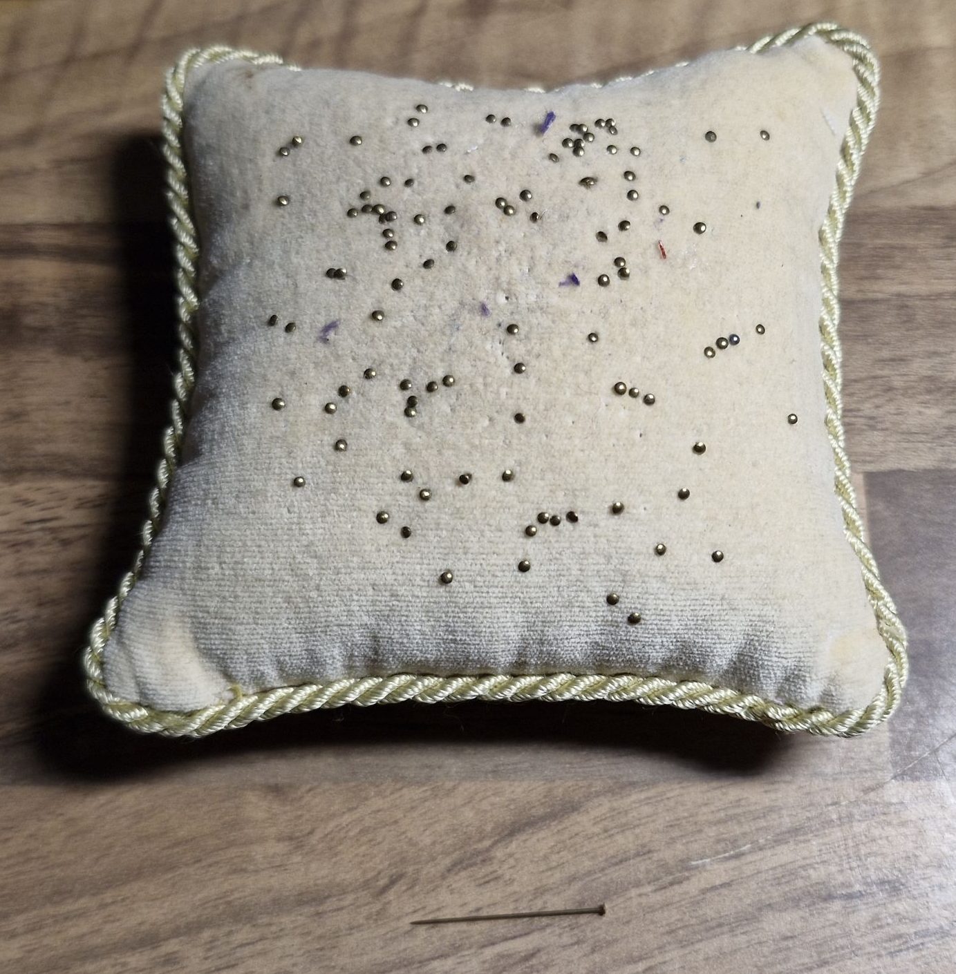 This is a large, stable pincushion that has seen plenty of use. I love the added door, windows and wheels, plus the buttons, that give the pincushion its vintage caravan appearance. The kind of pin stored here can be seen at the bottom of the photo. It’s a glass headed pin about one and a half inches long (37mm). The bulk of the pincushion makes it really safe – no danger of the pins going through to the other side.