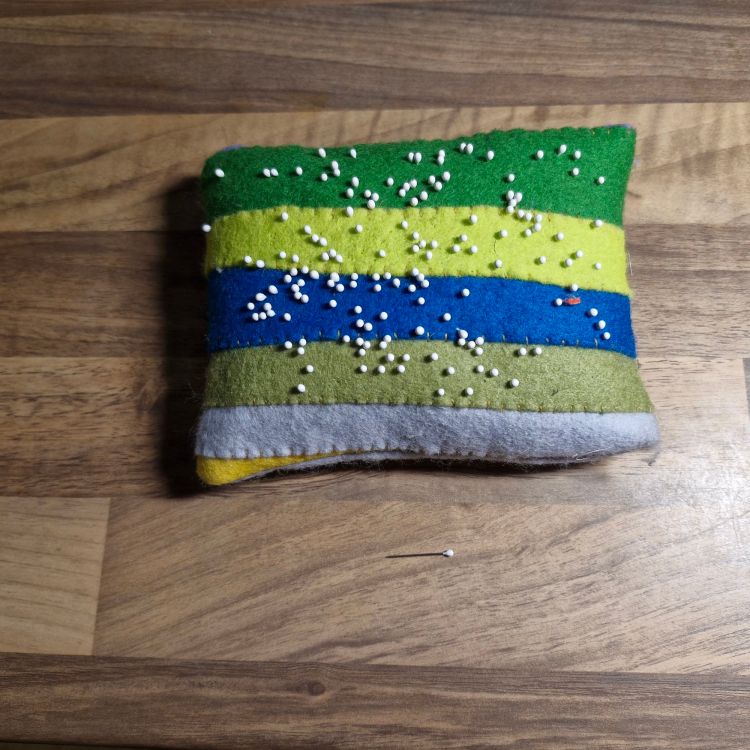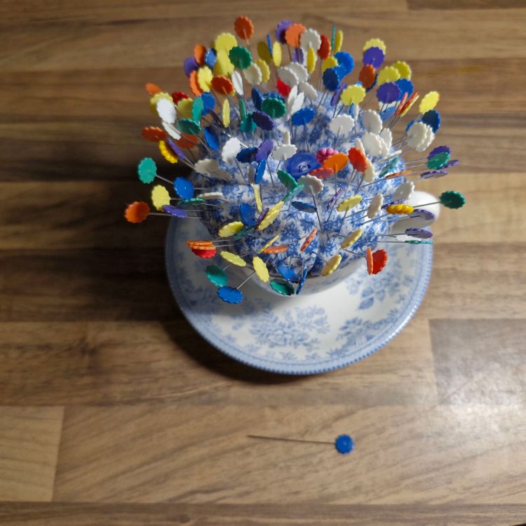 The pincushion below is clearly handmade and came to me via a tombola I think. In it are large hat-pin size pins, which are excellent for pinning out a quilt-back on a carpeted floor (I insert them at an angle – like tent pegs). In the centre is a slightly random selection of larger and longer glass-headed pins. Every now and then they are useful and I like to keep them separate from the blue and the yellow ones seen above.