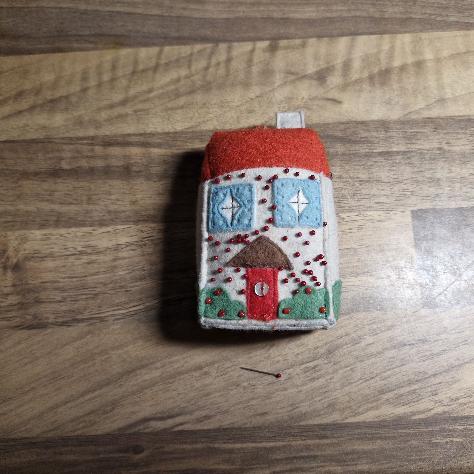 These are red appliqué pins which sit in a cute house-shaped pincushion.