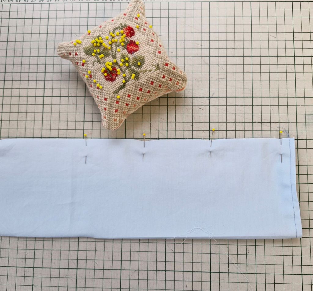 7 Next, open out the strip again and place the two long, raw edges together, with the wrong sides of the sleeve together. Pin the edges together with the pins at right angles to the edge, as shown.