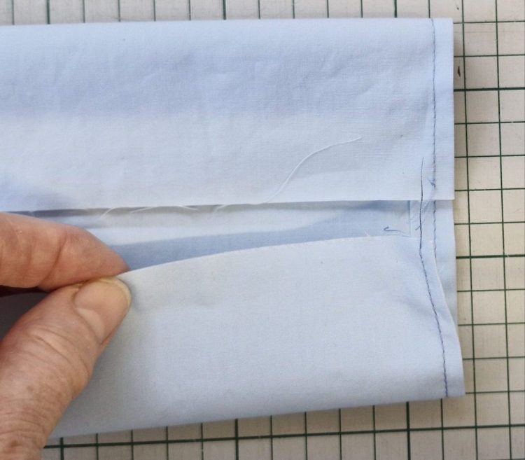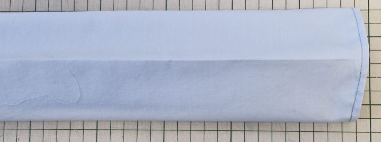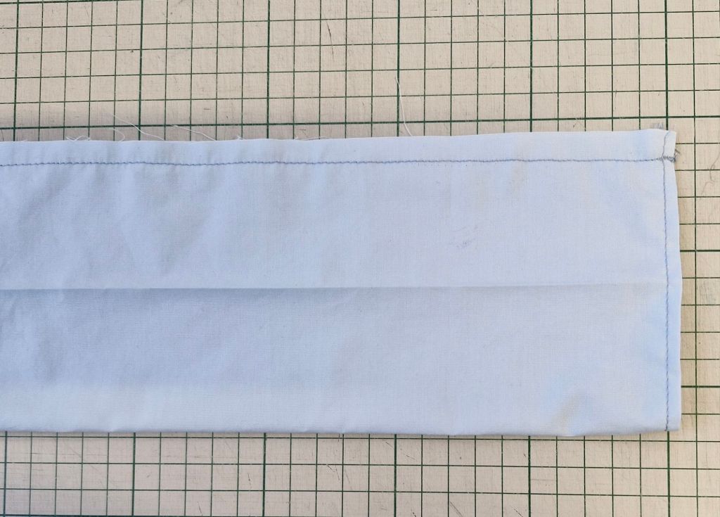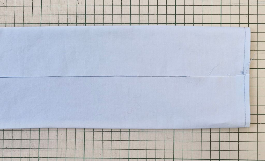 4 Lift off the sleeve. Stitch down each fold at on the sewing machine. as seen below. Then fold the strip in half, along its length, with the wrong sides together. Press the fold with an iron. This fold acts as a marker.