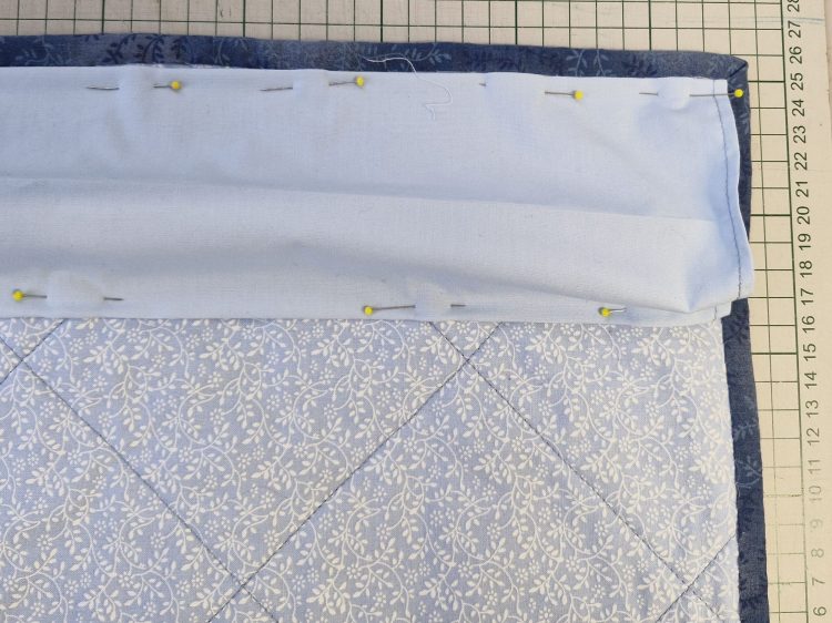 10. Place the sleeve along the top of the back of your quilt between the two side bindings and below the top binding. Pin in place. inserting the pins along the pressed-in folds at the top and bottom of the sleeve. Pin them in such a way that you can stitch all round the outside of the sleeve. (This sleeve is pinned for a right-handed stitcher.