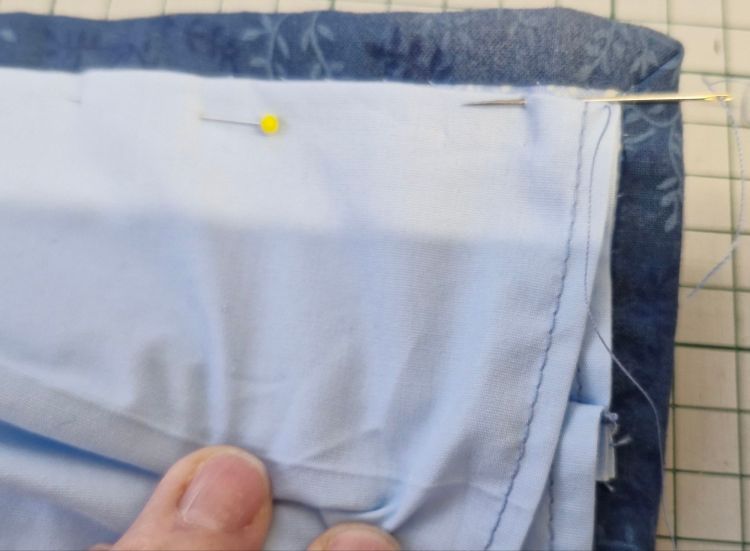 11. Carefully stitch the edge of the top fold to the quilt by hand, ensuring that the stitches do not come through to the front of the quilt. Stitch down the short side , then the bottom fold and finally the second short side. NB, the seam you stitched to join the raw edges is now held at the back of the quilt behind the sleeve so it is out of the way of any batten put through the sleeve.