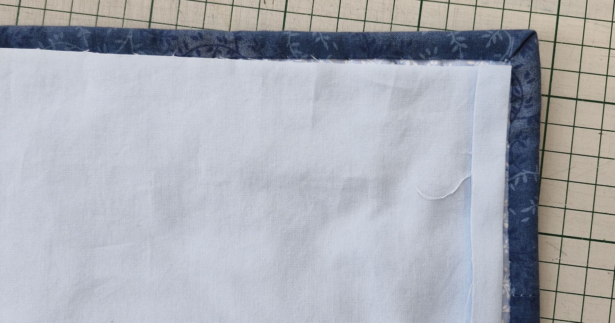 3. Turn in half an inch at each short end of the strip and press with an iron. When you place the strip along the top edge of your quilt, it should lie just inside the finished binding of the quilt, as shown in the photo below.