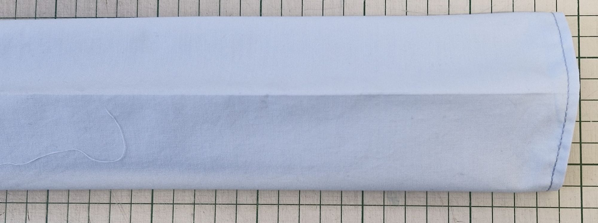 4 Lift off the sleeve. Stitch down each fold at on the sewing machine. as seen below. Then fold the strip in half, along its length, with the wrong sides together. Press the fold with an iron. This fold acts as a marker.