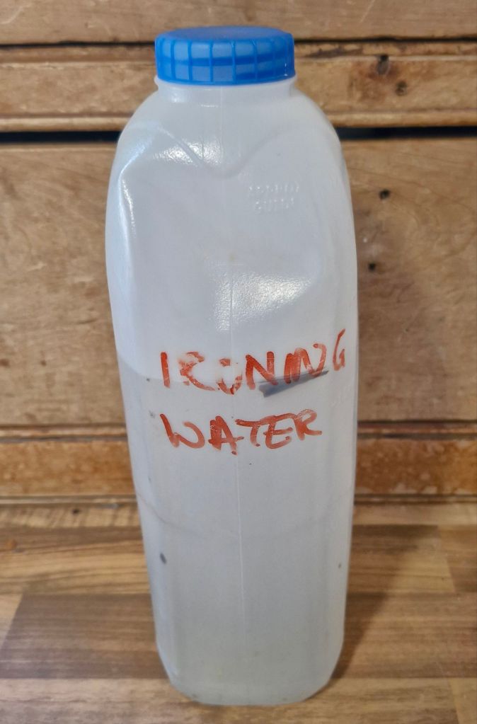 I live in a hard-water area so I always use distilled water in the iron. Given that I live in an old cottage in a seaside town, it is perhaps not surprising that I own a de-humidifier. The water from the de-humidifier is perfect for the iron, so it is decanted into a suitable bottle and labelled, ready for use.