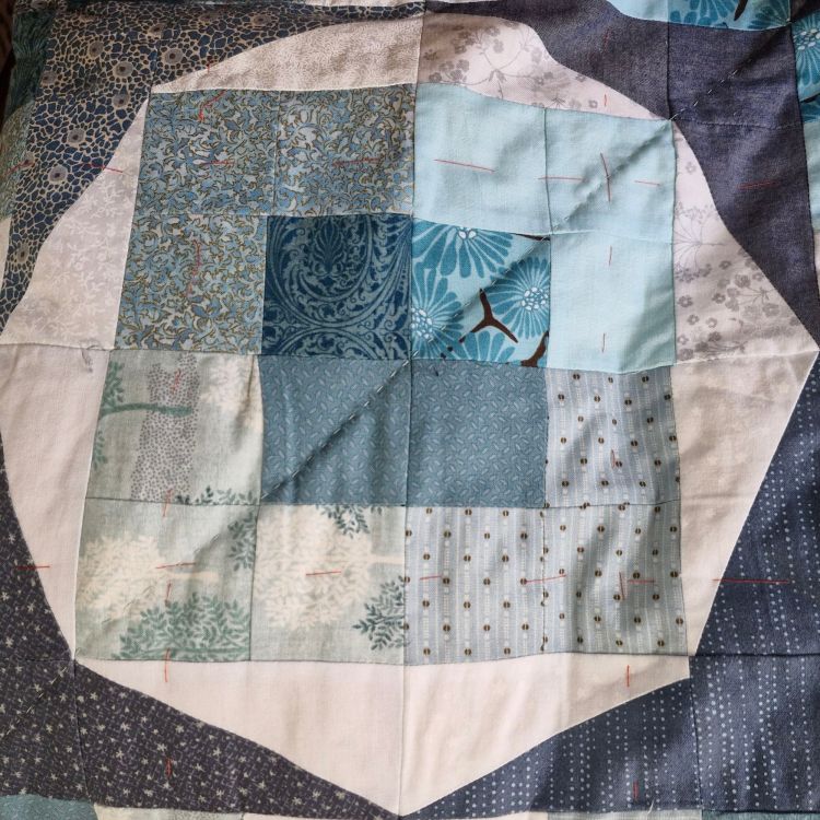 My project? I am working on a large bed-quilt, made using blue and aqua fabrics that once belonged to a friend who was part of Durham Quilters and who died of cancer during the pandemic. I pieced the blocks together and layered up the quilt last week so that I could spend the time at Shepherd’s Dene hand-quilting.
