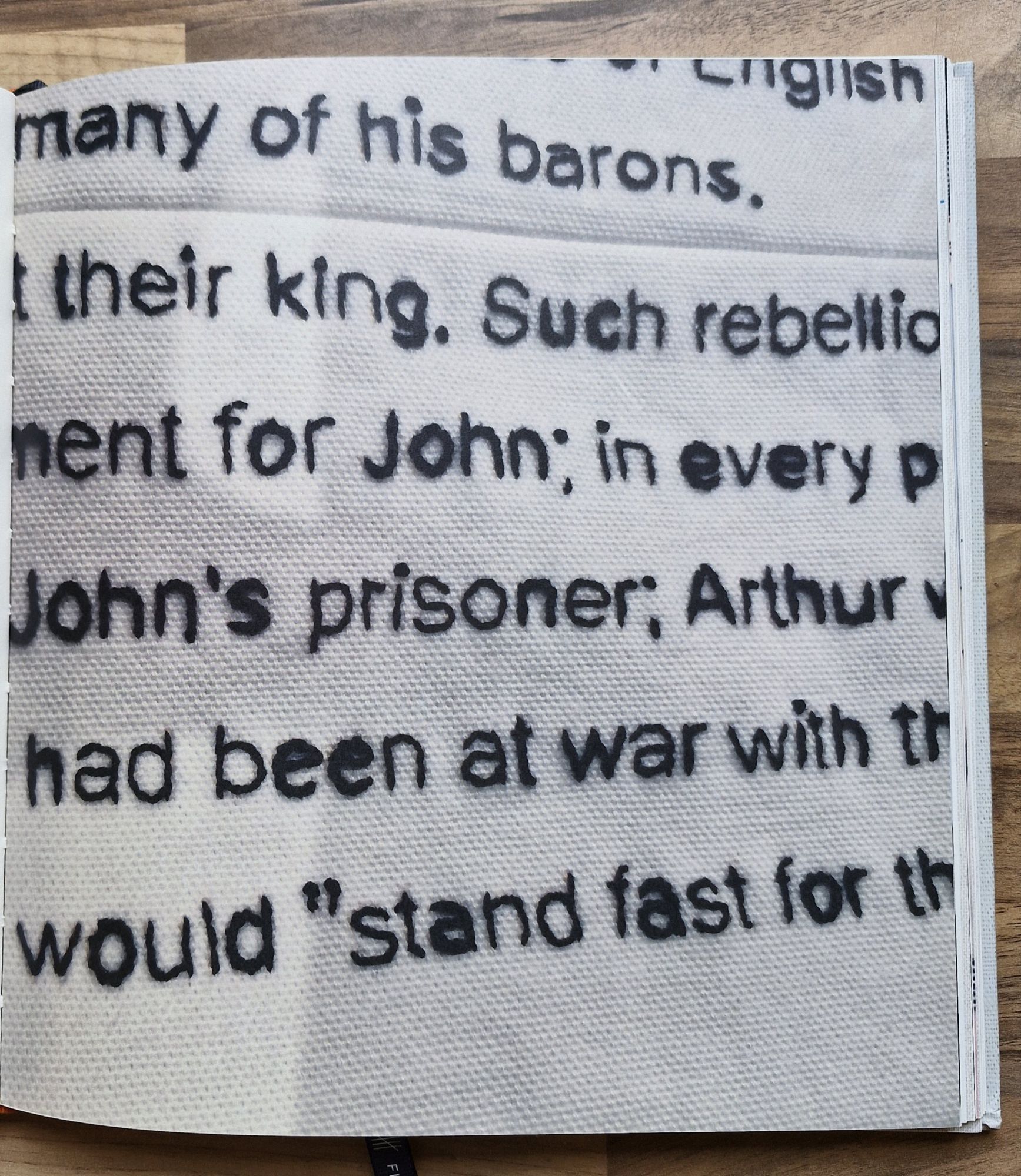 I also remember seeing on display a reproduction in stitch of the Wikipedia entry of Magna Carta, which was stitched in part by Fine Cell Work stitchers in 2014. The whole embroidery was 13 metres long. It was produced in pieces.