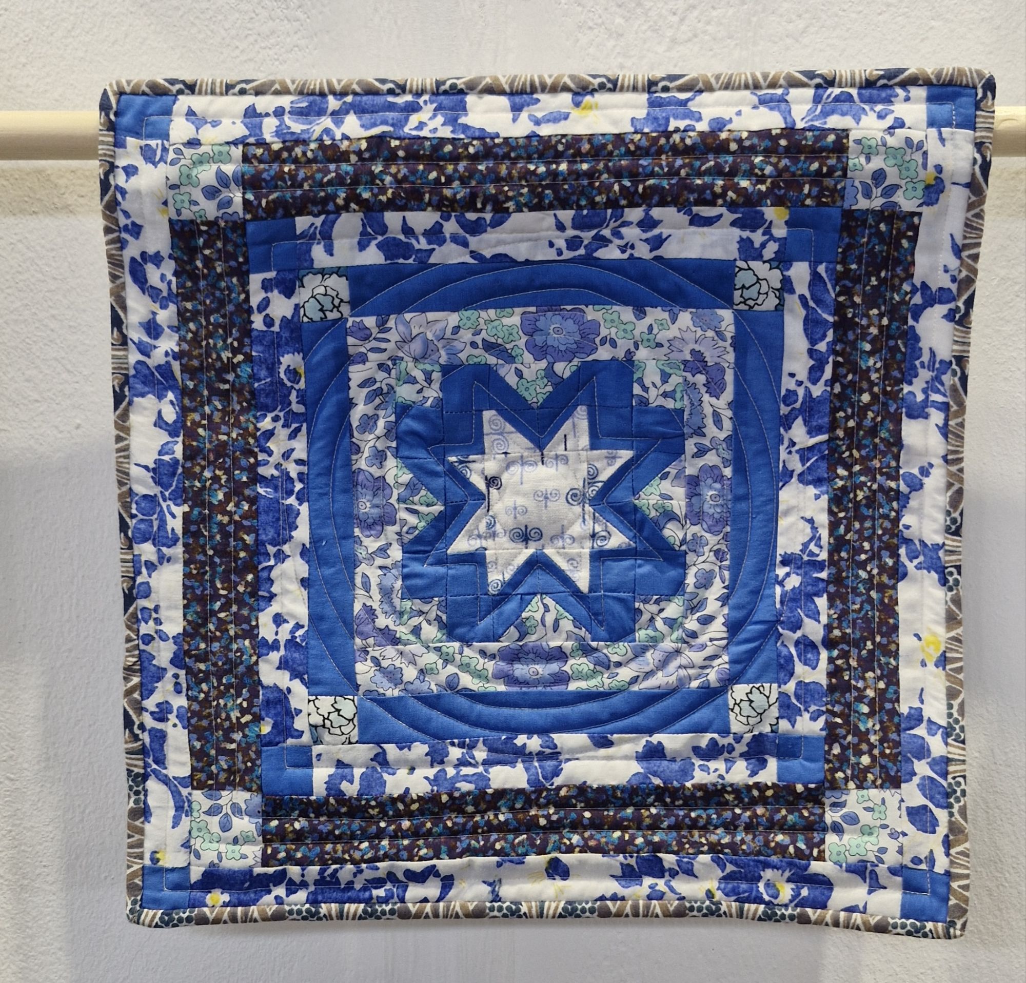 Finally, here are the three quilts I entered. First up is ‘Bright Morning Star’ a miniature quilt, measuring 22cm (eight and five-eighths inches) square:
