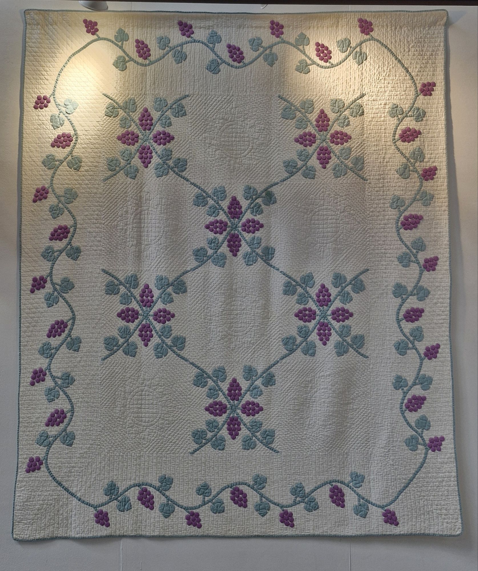 Speaking of old quilts, I enjoyed spending time in the stand presented by The International Quilt Museum, Nebraska, USA, who were displaying quilts made from patterns offered free to customers with a purchase of ‘Mountain Mist’ wadding from 1929 onwards. On each wall, hung beautifully hand-stitched and quilted pieces which used traditional motifs and patterns. I loved them. The following three photographs are included by kind permission of The International Quilt Museum. (You can find out more about the Museum here.)