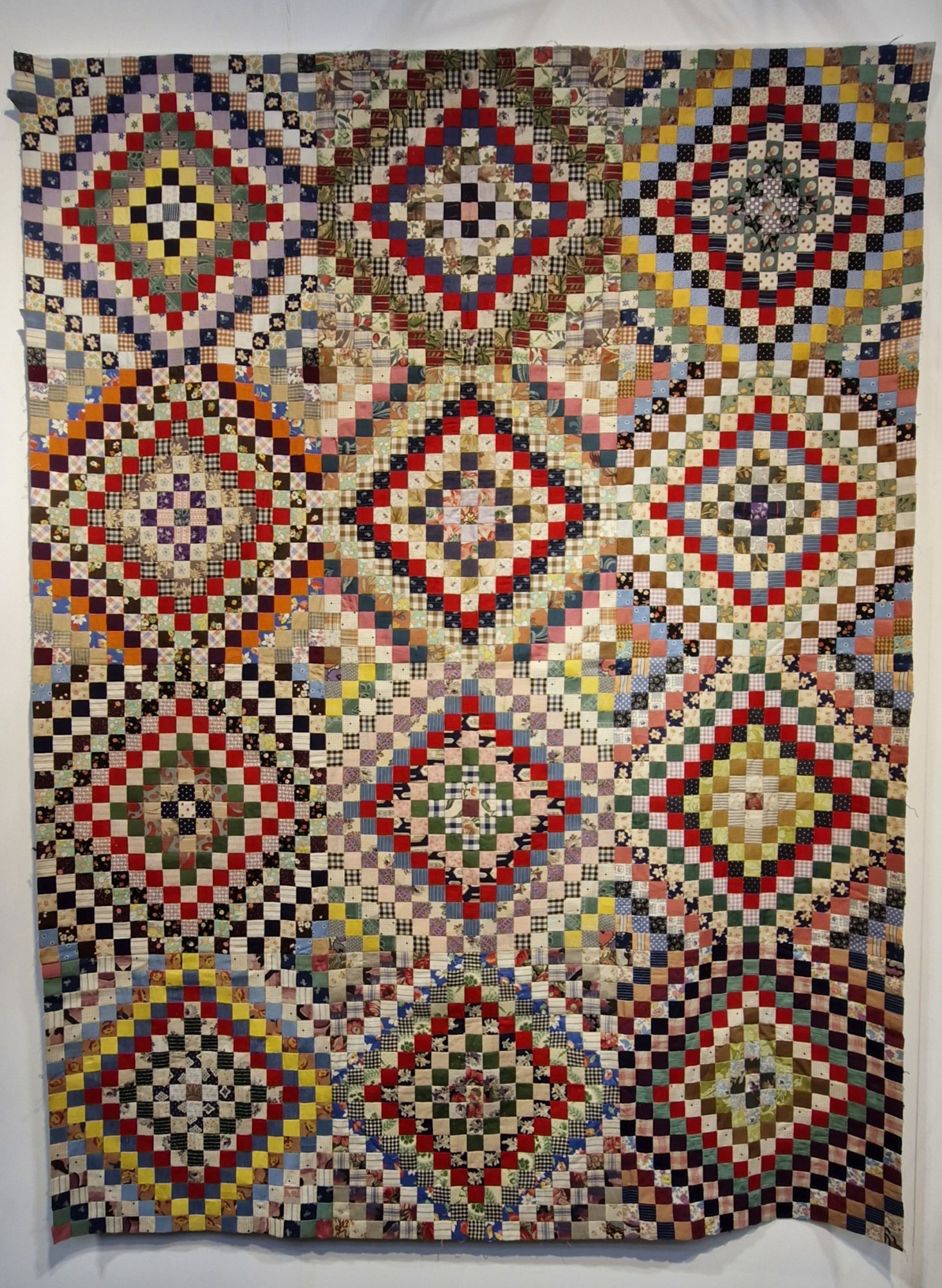 The Quilters’ Guild of the British Isles showed items from its collection at the Festival, concentrating on the years before, during and after the Second World War. The quilt below (‘Small Squares Top’, 1930-39, maker unknown) demonstrates a delightful version of ‘Trip around the World’ block. The quilt top is all hand-stitched and remains just a single layer it has not been layered up into a quilt.