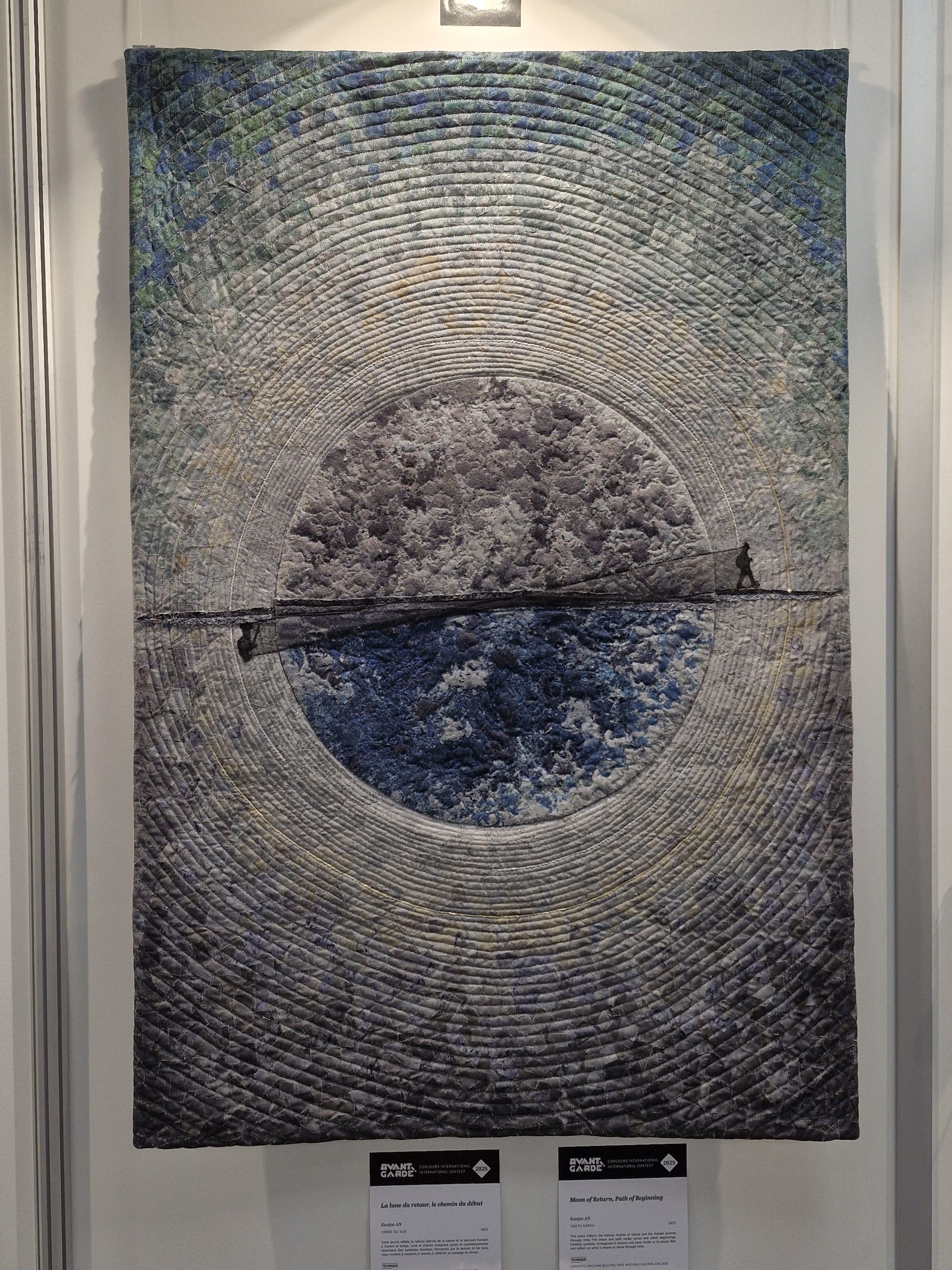 At the centre of the event is the Concours International (International Contest) which this year had the theme ‘Avant-Garde’. Only thirty pieces are chosen from all the entries (over a hundred and twenty this year). Each piece must fit the theme and be produced to a set size (80 x 120cm). The winner was announced at the show but all the attendees are also invited to vote for their favourite, so I’m going to share with you the one I liked best, which I found it intriguing, subtle and beautiful, ‘Moon of Return, Path of Beginning’ by Eujoon AN from South Korea:
