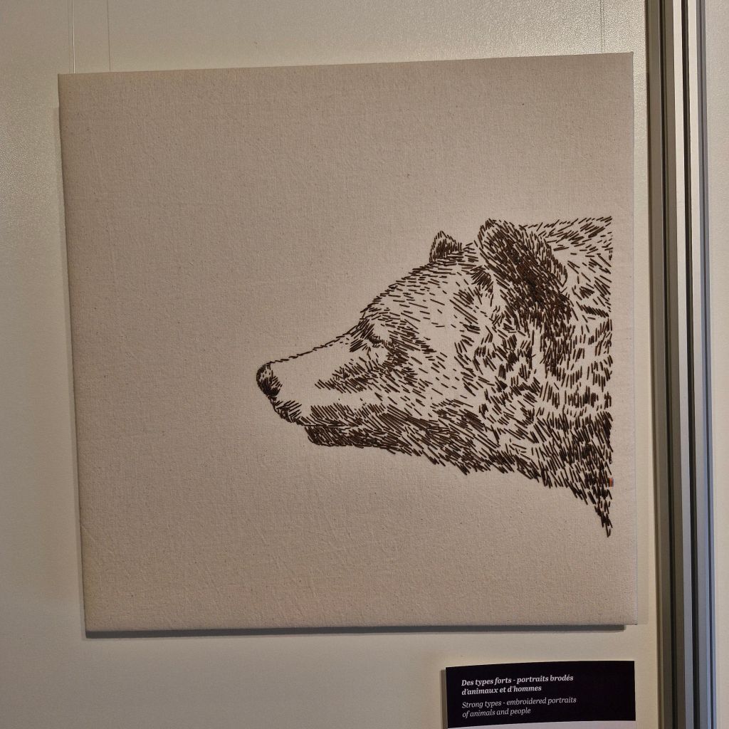 I thoroughly enjoyed seeing Ulla Hoppe’s embroidered pieces where stitched lines appear like strokes of a black pen as in the portrait of a bear pictured below: