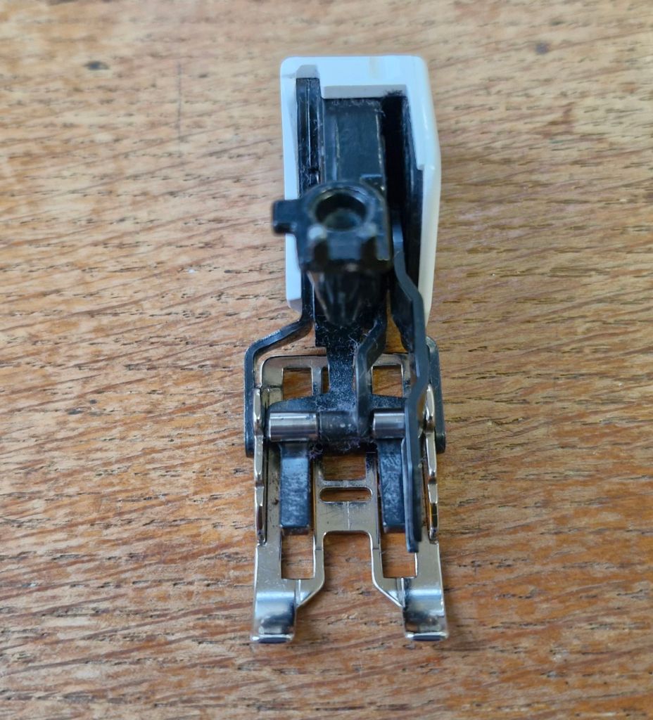 When you first start out with quilt-making, you will probably use your regular presser foot and stitch plate (as shown above) when it comes to actually quilting the three layers of your quilt. However, as time goes on, you will find it helpful to buy a walking foot for your machine (shown below). This helps the three layers of the quilt to pass evenly through your machine.