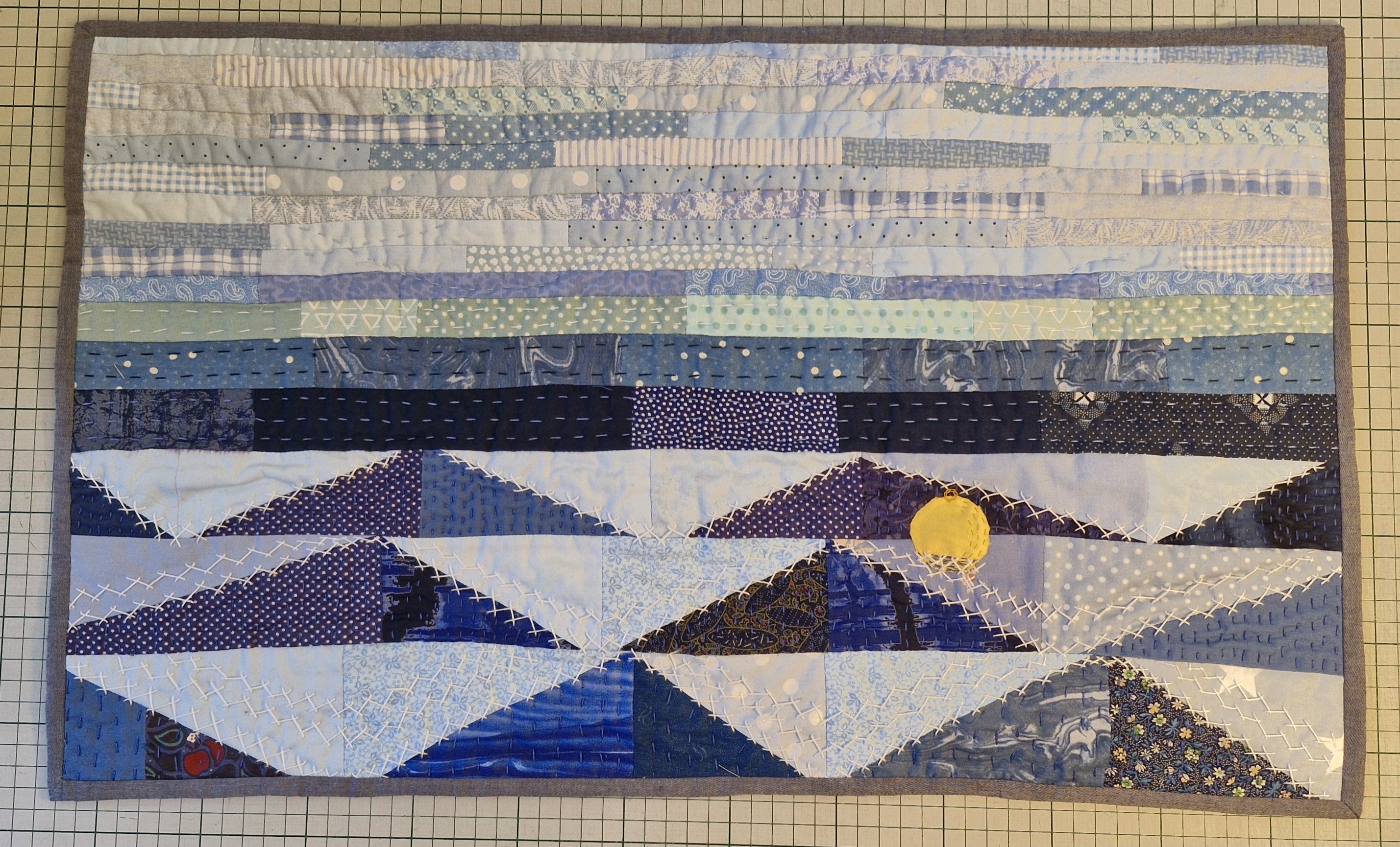 The quilt below is included because it depicts the ‘Blue Mountains’ in Australia, which I visited in 2010. I made the quilt soon after the visit and included in it fabrics which I purchased in Australia. The eucalyptus trees in the area around the Blue Mountains exude oil which combines with water droplets and dust to form a haze which causes the mountains to look blue. It’s a beautiful sight.