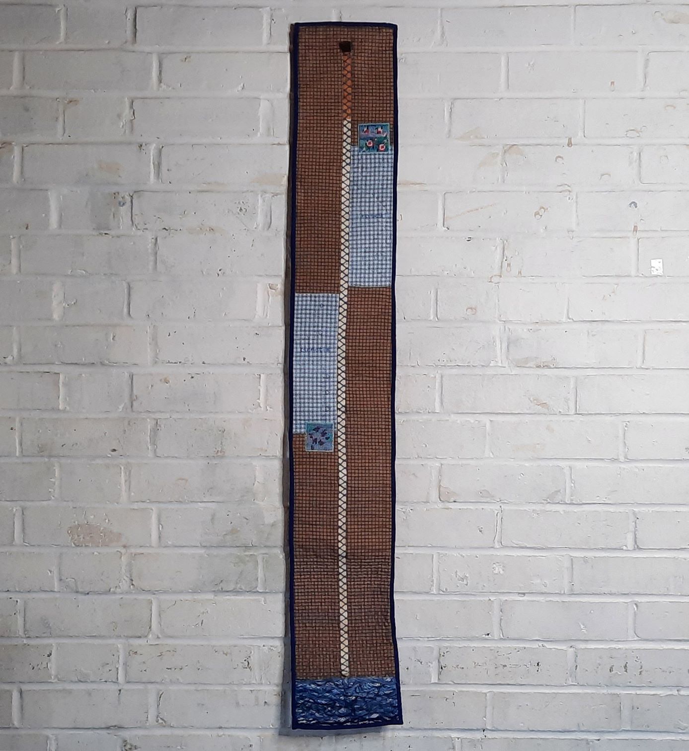 Below is a narrow piece which hangs in my house. It is all about memories of my father who enjoyed designing gardens – including our own at home – and who owned a measuring tape like the one I found washed up on the beach and included in the piece. The background is blue/tan check, there are blue and white checked areas and blue threads at the bottom to suggest the sea…
