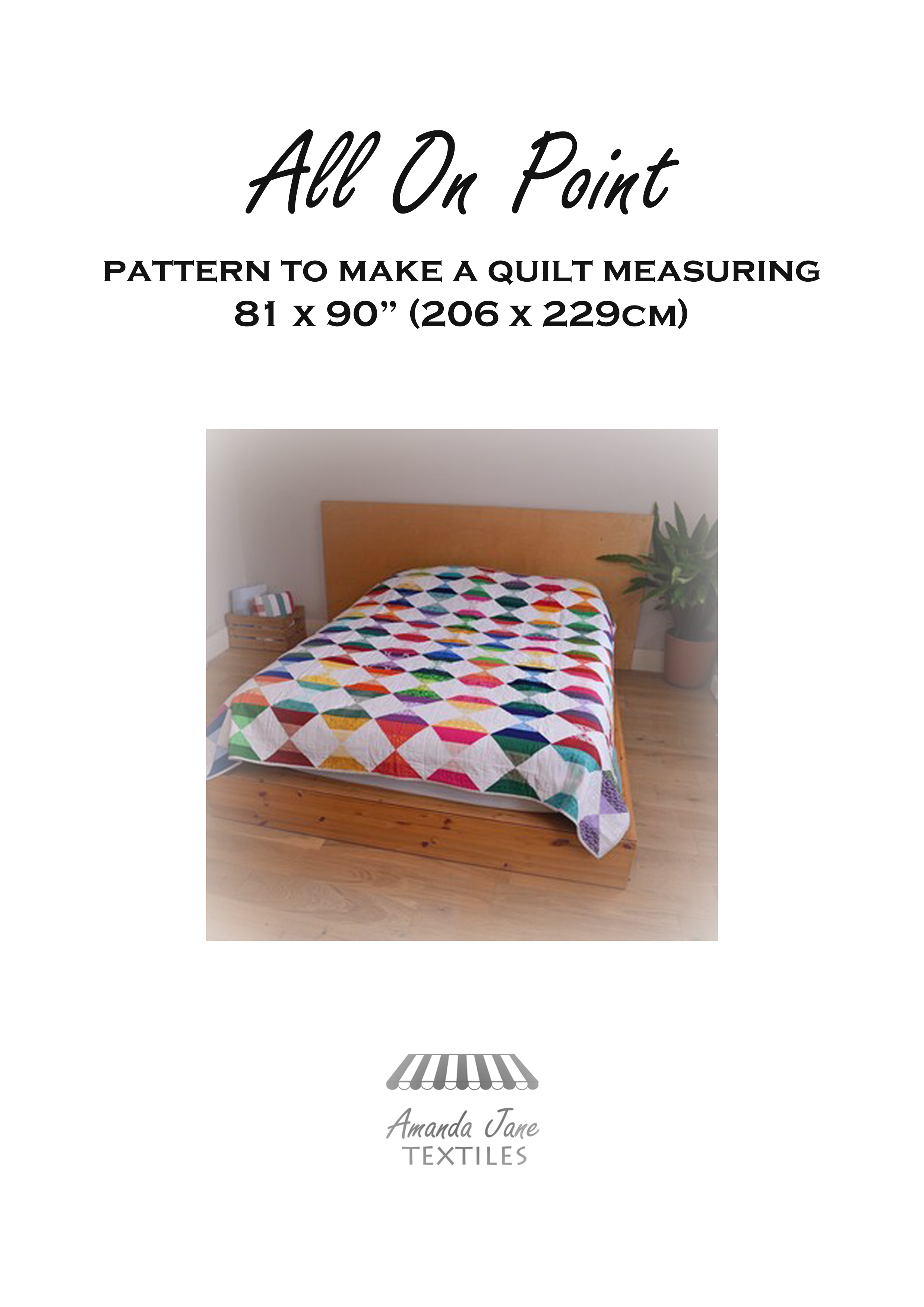Hello! What these grey February days in Britain need is a bit of colour! So today I am introducing to you the latest pattern to appear in the Amanda Jane Textiles Etsy shop: ‘All on Point’. It is a really large quilt (81 x 90″) which is positively full of colour. It is extremely scrap-friendly so you can really make inroads into your scrap baskets, although all the measurements are given if you choose to make the quilt from yardage.