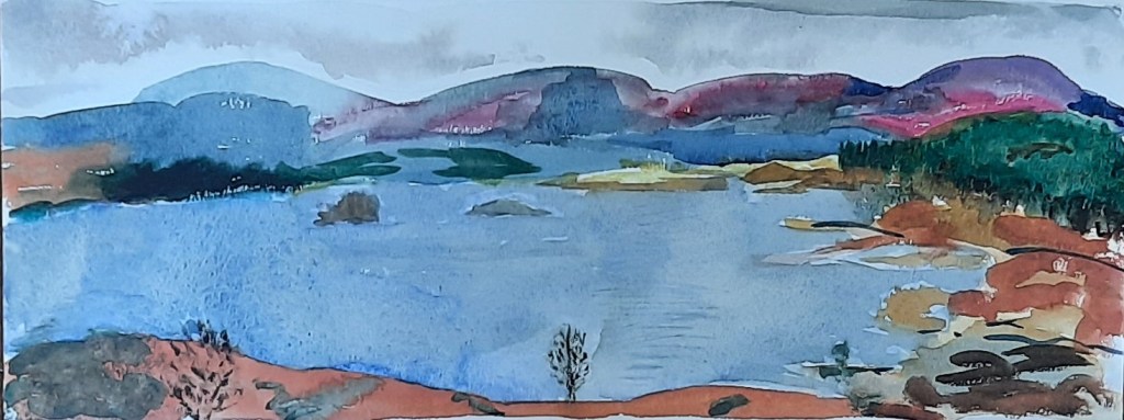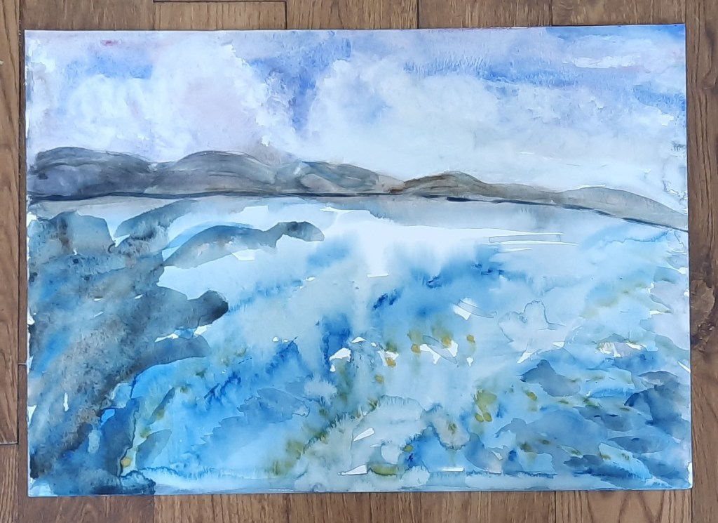 Watercolour on watercolour paper. 38 x 20cm (15 x 8″) Signed AJO