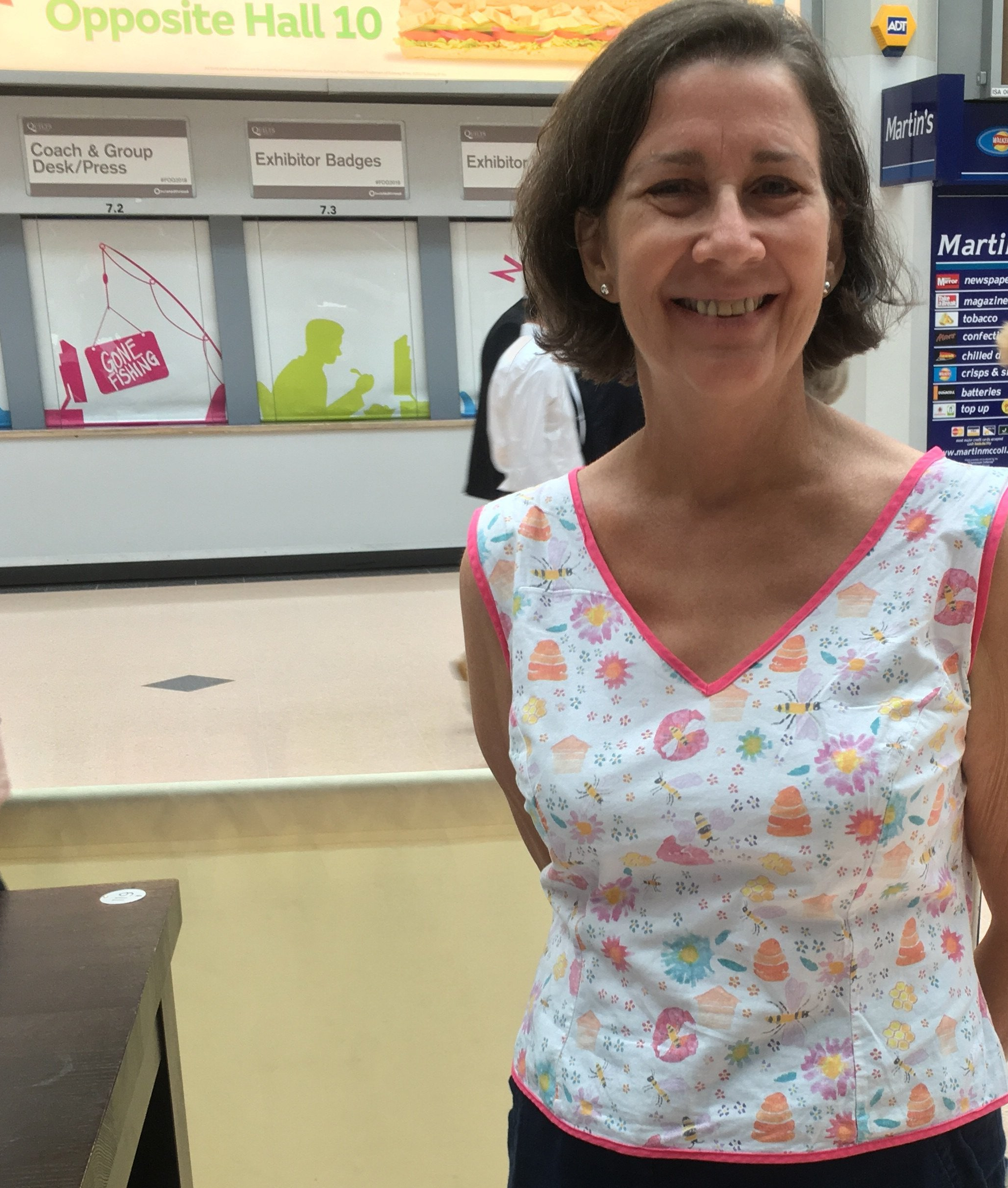 Amanda Jane Ogden wearing a top made of ‘Bees and Bumble Bees’ fabric on Spoonflower