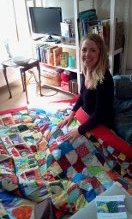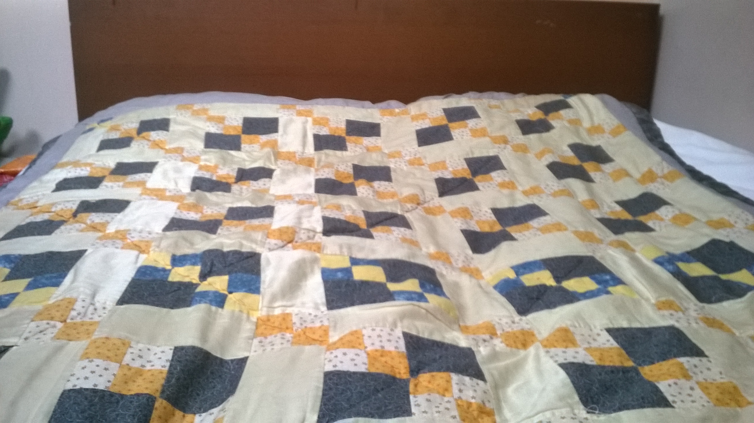 The ‘yellow, blue, grey one’ was photographed when it was handed over in the Pret a Manger next to Kings Cross, but no-one knows what has become of the photo! The quilt is still in use and currently looks like this: