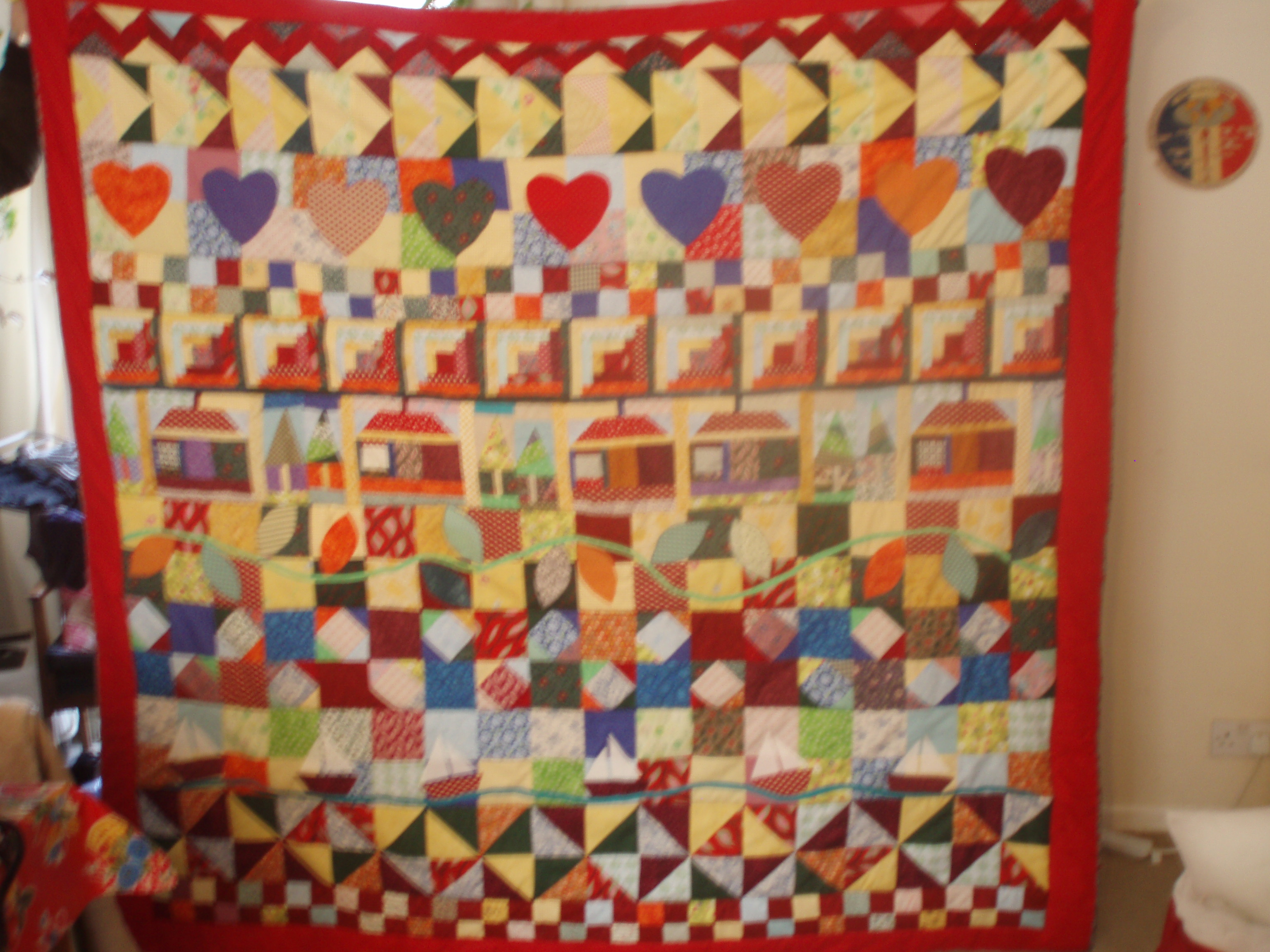 Next came a wedding quilt (which was made in the same year as the wedding dress described elsewhere on this site). Given that there were also five bridesmaids’ dresses to stitch, I liked the idea of a sampler quilt designed by Davina Thomas, where one row was published each month in ‘Popular Patchwork’ magazine (www.popularpatchwork.com). I used the bright colours that the couple like, and added in a few rows of my own, including a row of sailing boats, as the wedding was to take place by the sea. I increased the width by half as much again and added a border too. This was machine-quilted as the pressure was on, time-wise!
