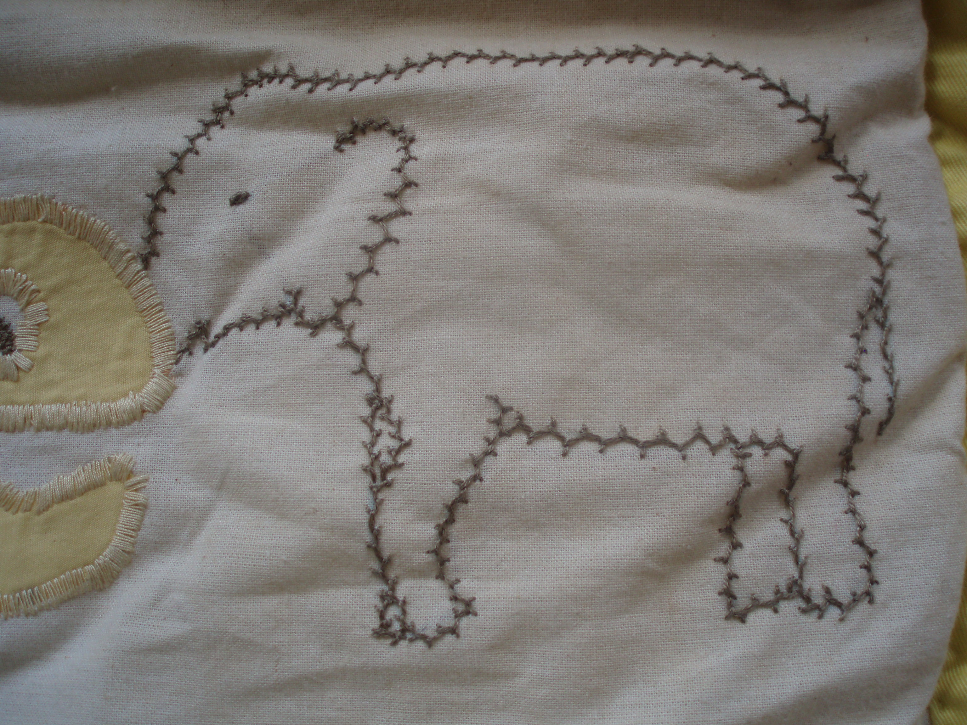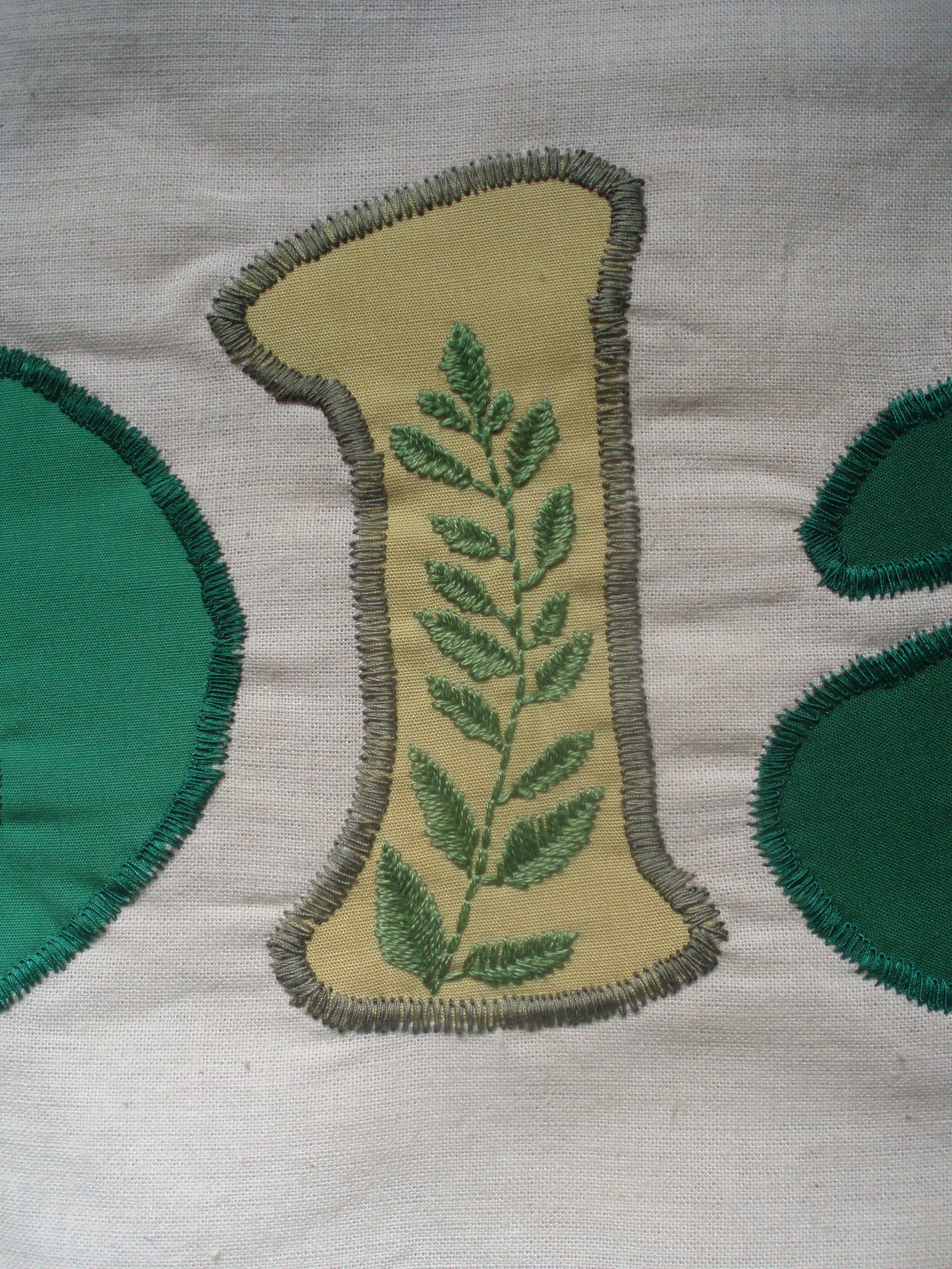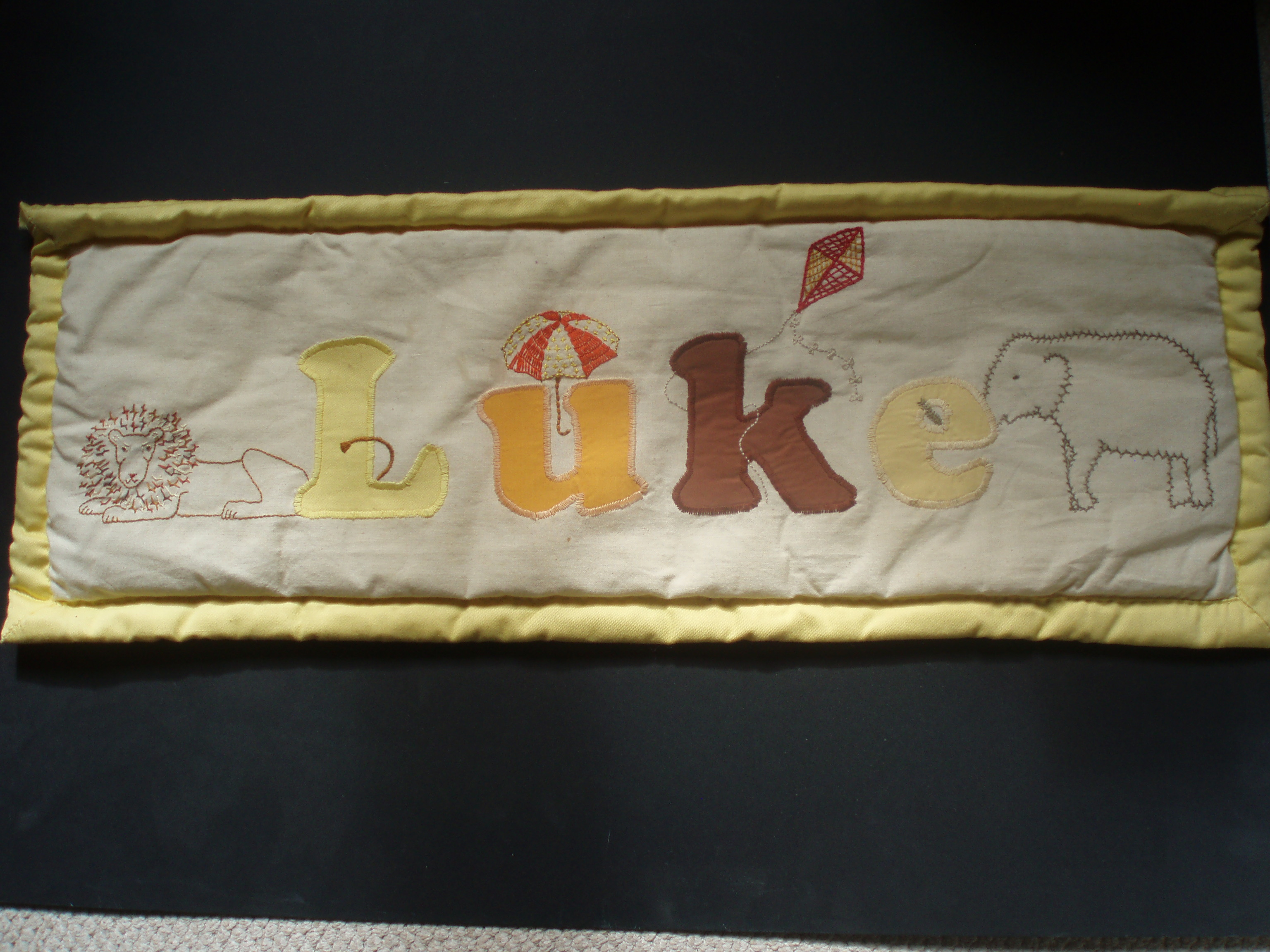 I’ve always enjoyed embroidery, which appears on these two banners, made for my sons. These were appliqued and hand-embroidered before being layered with wadding and a backing fabric. The banner is quilted around the edge of the frame. A detail of the embroidery in each banner can be seen in the photos.