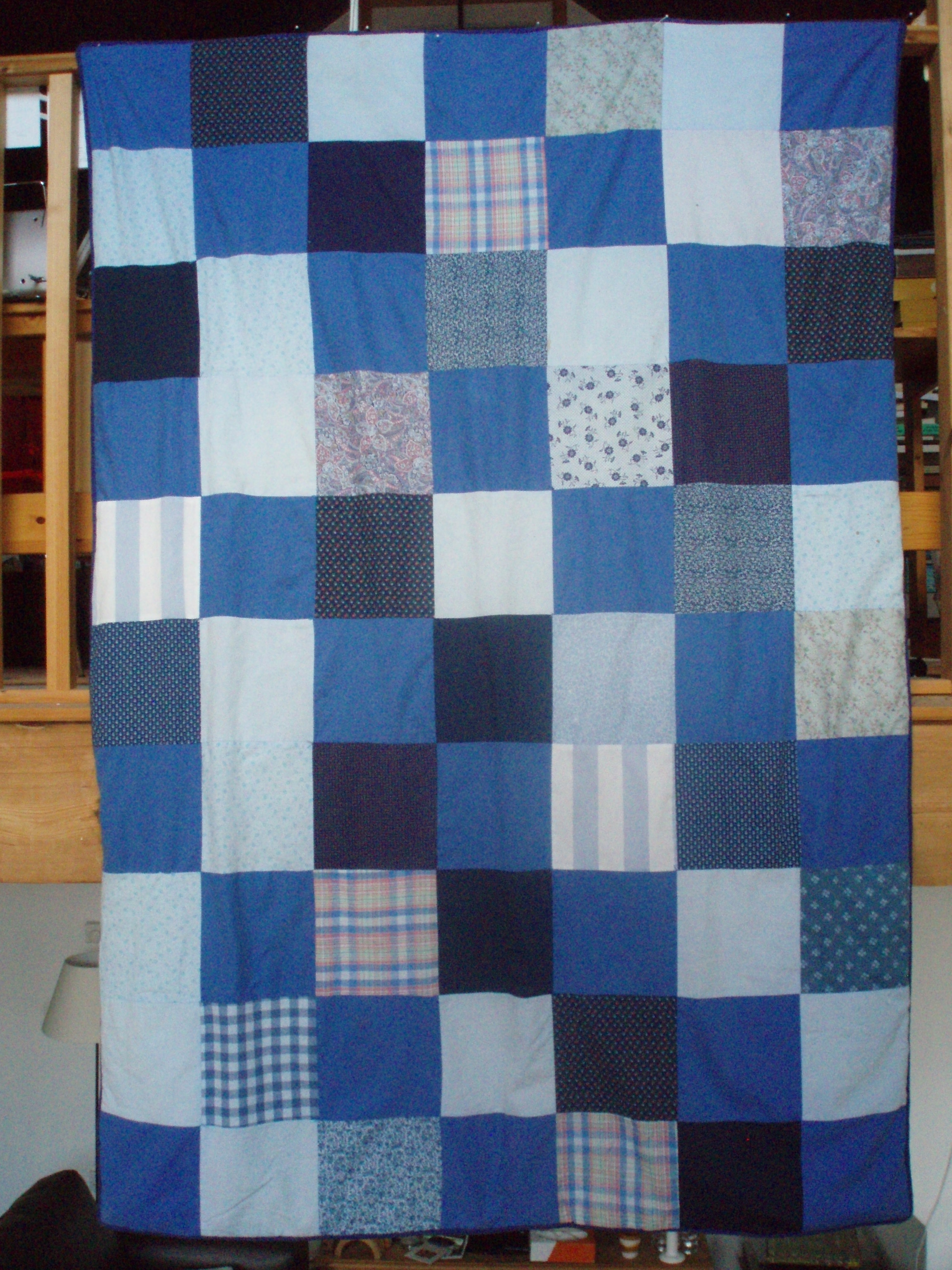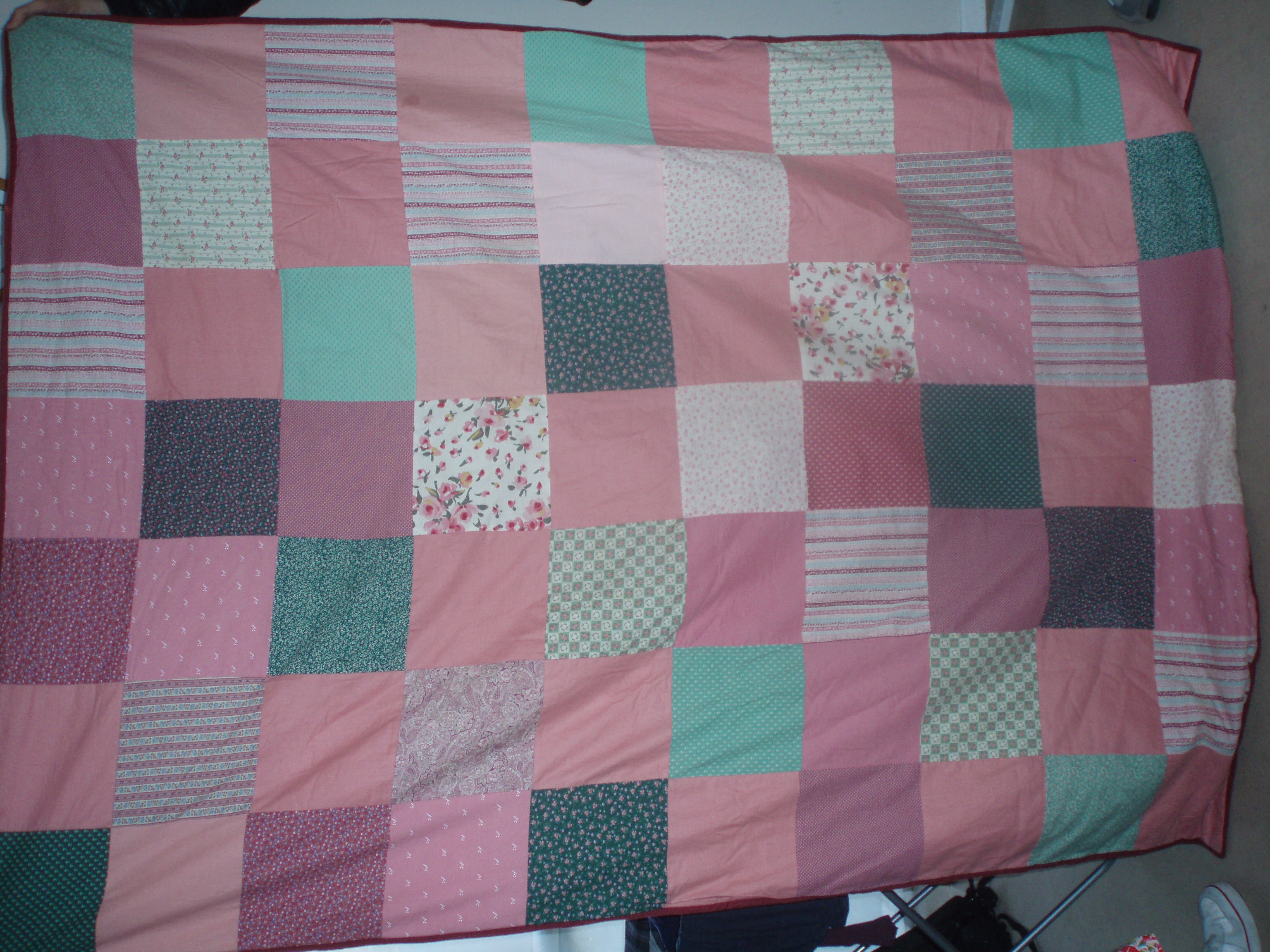 A single bed quilt went off to university with each student in the family. The first two were both made using simple squares, joined on the sewing machine and tied through the three layers rather than quilted with stitches.
