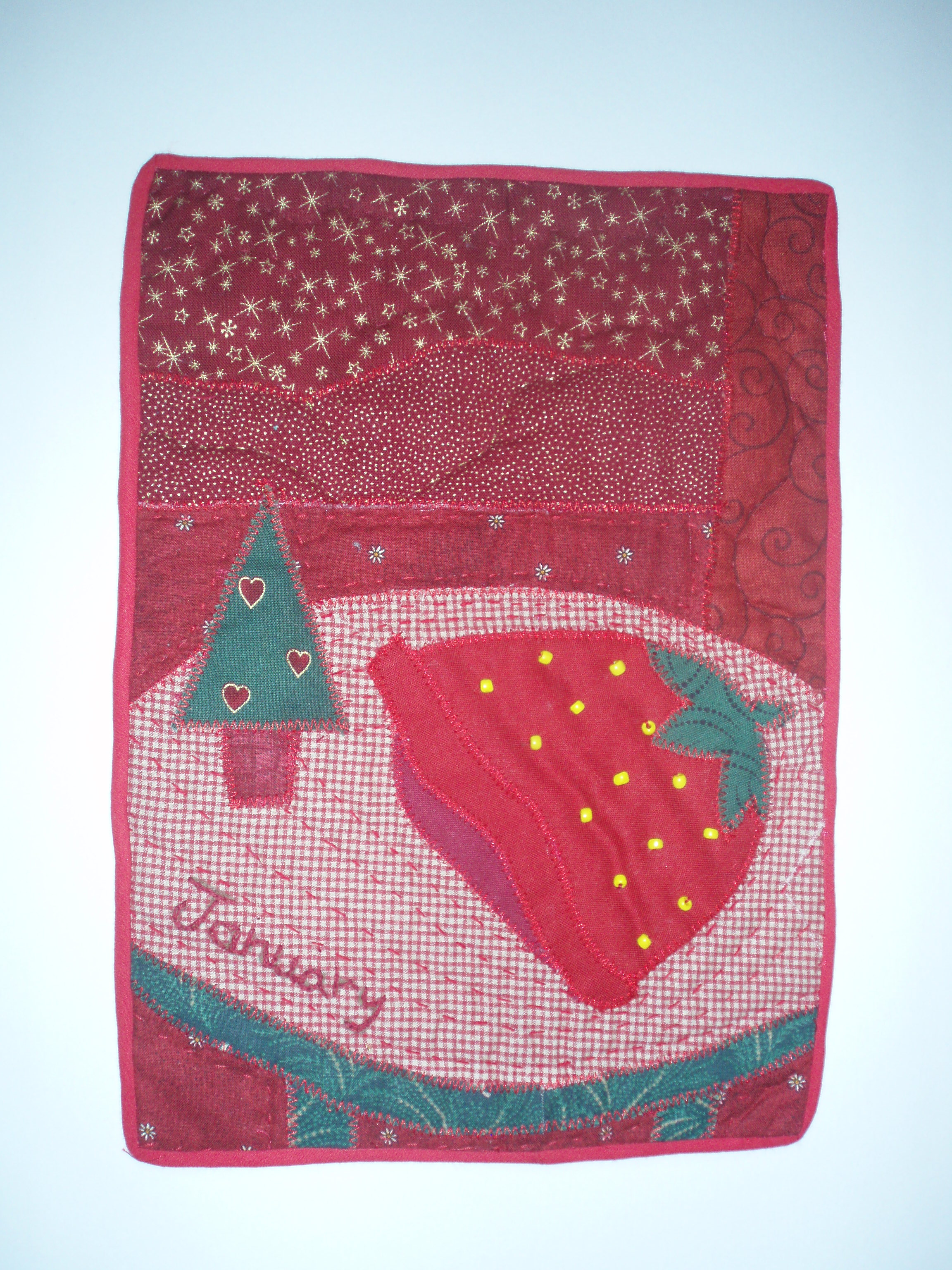 In 2012, I took up the ‘journal quilts’ challenge offered by the Contemporary Quilt Group, which is a special-interest group of the Quilters’ Guild (www.quiltersguild.org.uk) and made an A4 sized quilt each month of the year. It turned out to be an eventful year, so this collection captures memories of an engagement, a wedding, an 80th birthday and a 30th wedding anniversary – amongst others. Here is the January quilt.