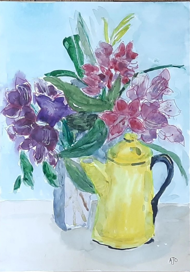 Yellow coffee pot and flowers by Amanda Jane Ogden